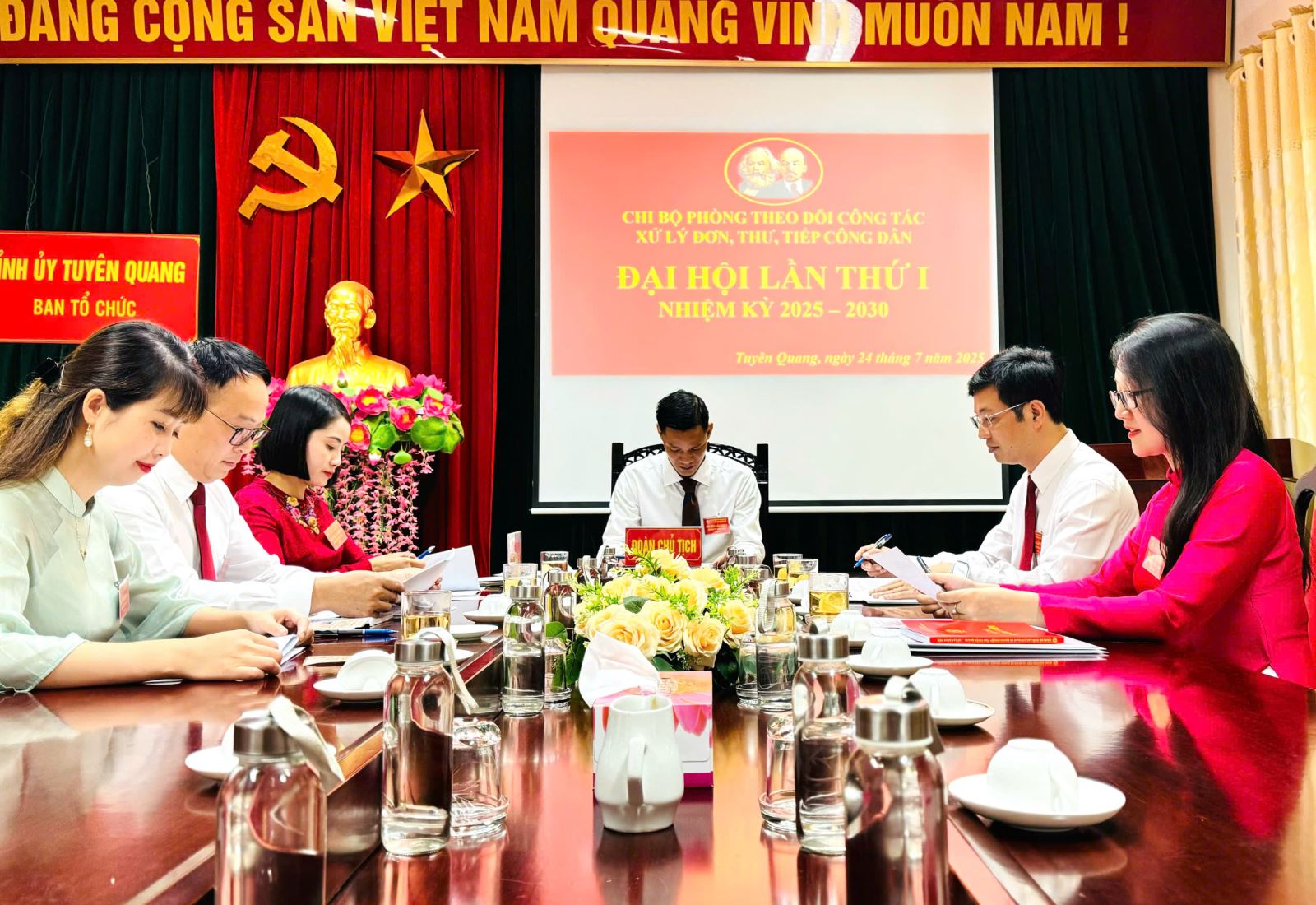 Đại hội đã thống nhất thông qua Nghị quyết Đại hội Chi bộ nhiệm kỳ 2025 - 2030, khẳng định quyết tâm phát huy kết quả đạt được, xây dựng Chi bộ Phòng Theo dõi công tác xử lý đơn, thư, tiếp công dân trong sạch, vững mạnh; nâng cao chất lượng về công tác tham mưu xử lý đơn, thư, tiếp công dân, đóng góp quan trọng vào sự phát triển chung của Ban Nội chính Tỉnh ủy.
